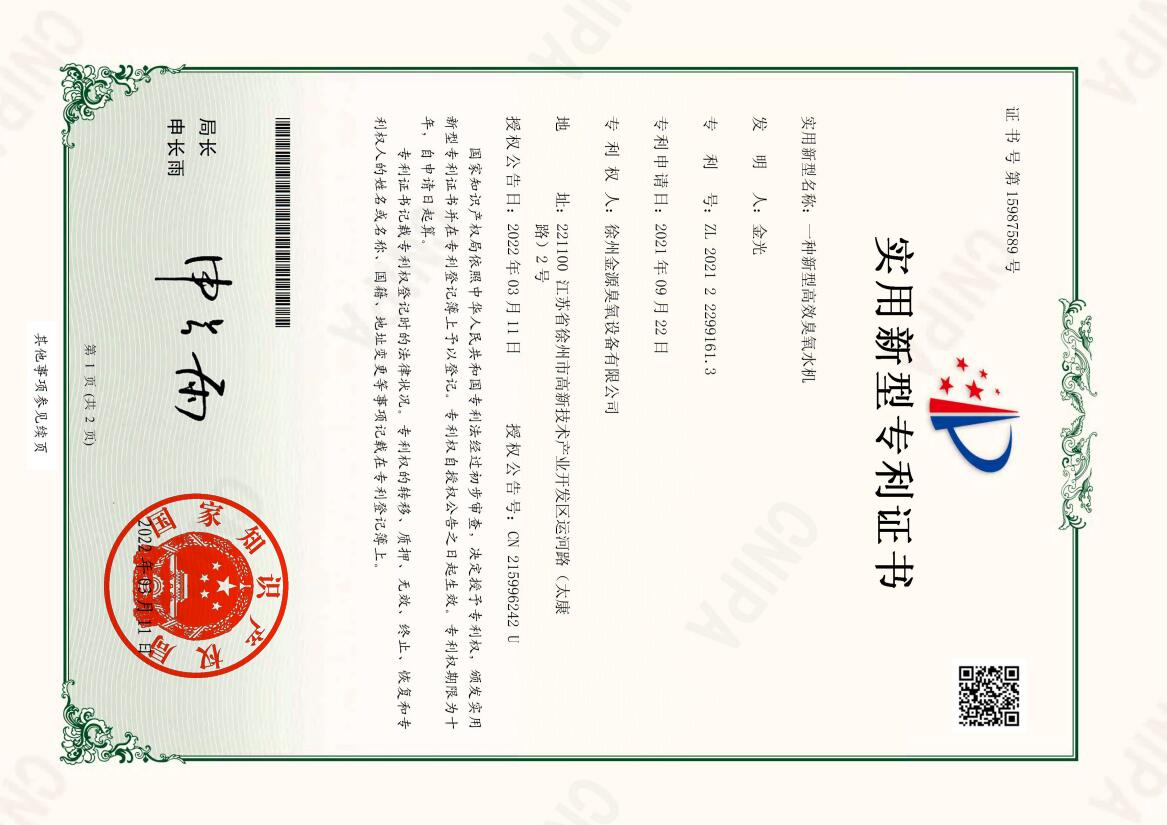 2021222991613-一种新型高效臭氧水机-实用新型专利证书